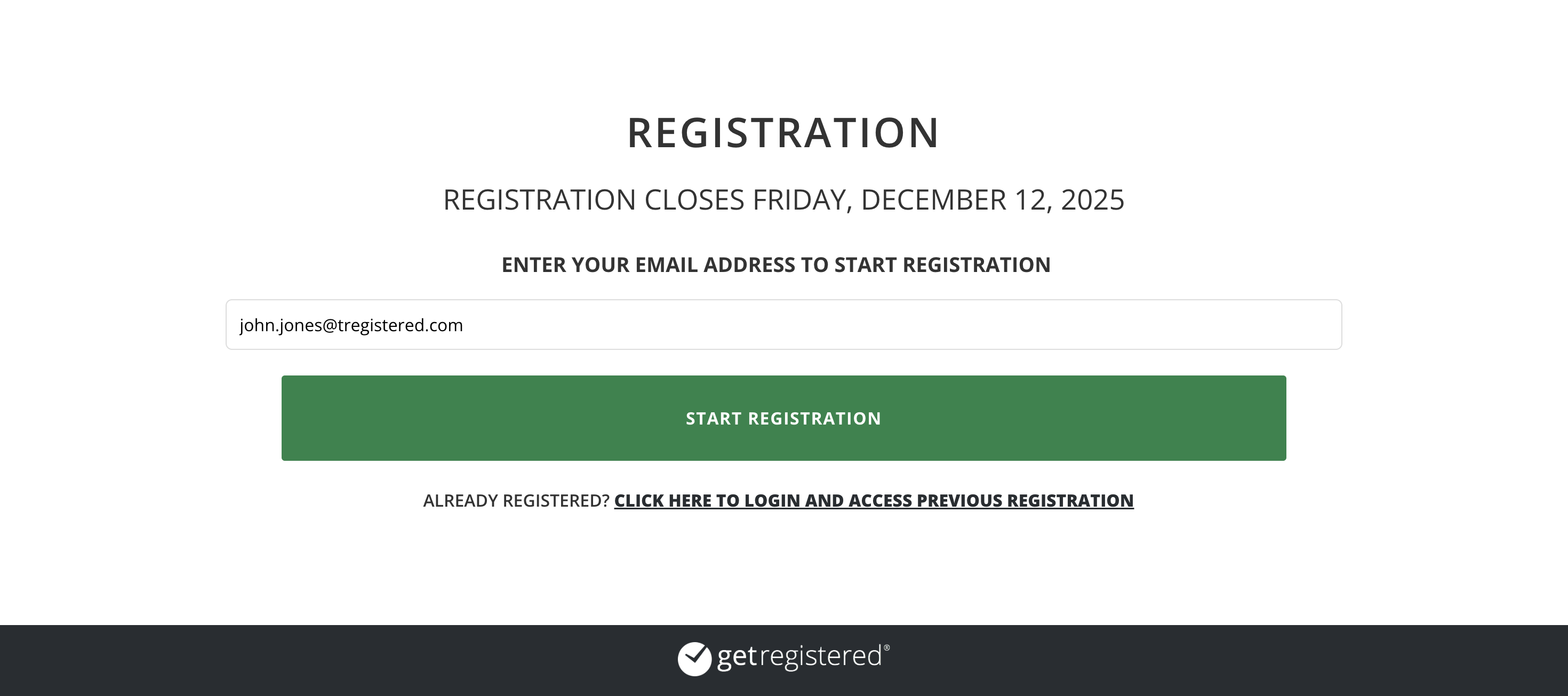 Alternatively, you may have received an invitation link directly from your event administrator. Following this link will take you directly to the event site - to begin your registration, click on 'Start Registration' option at the top right of the Home page. Your email address should already be pre-populated in the box above the ‘Start Registration’ button, simply select the button to begin your registration - simple as that!