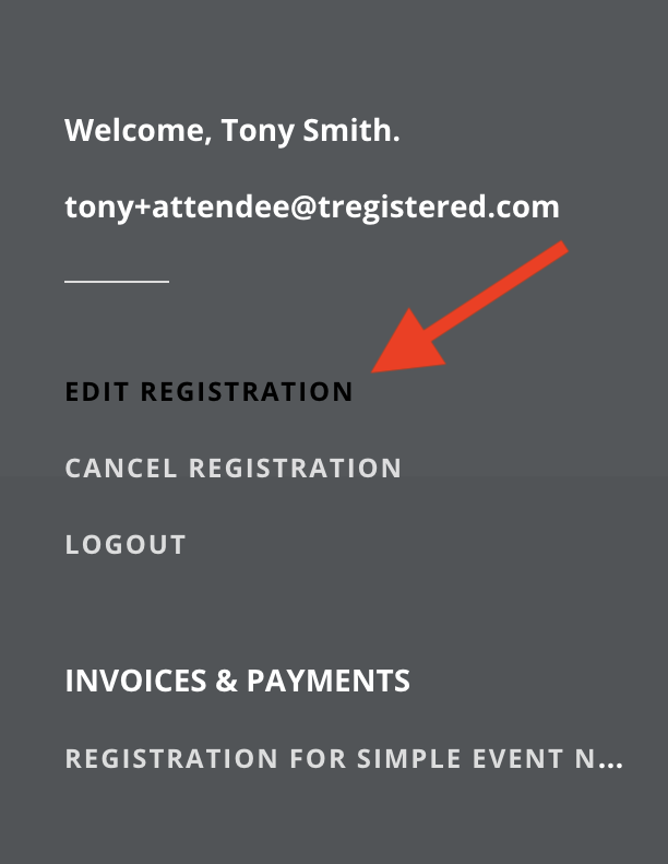 Once you are logged in select the 'Edit Registration' option displayed under the menu at the top right of the page.