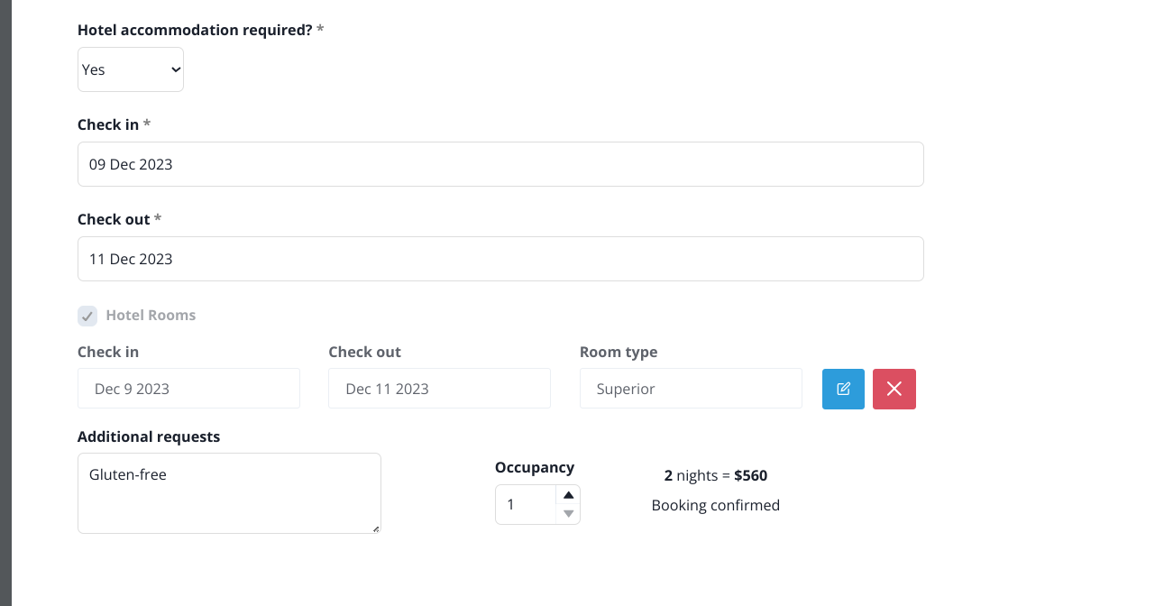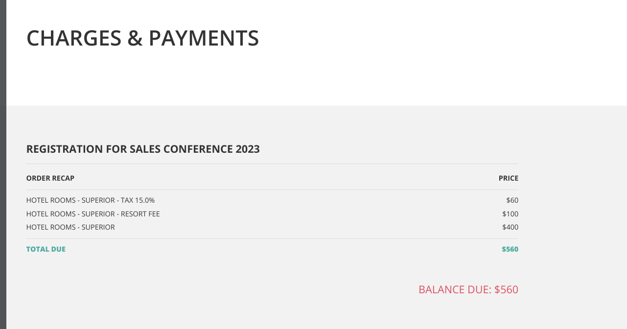 This section appears when you have selected choices in your registration form that have a monetary value assigned (eg an activity, hotel room or meal). You can easily identify these choices when creating your registration as they will display a monetary value adjacent to the listing in the field (as demonstrated in the screenshot below).
