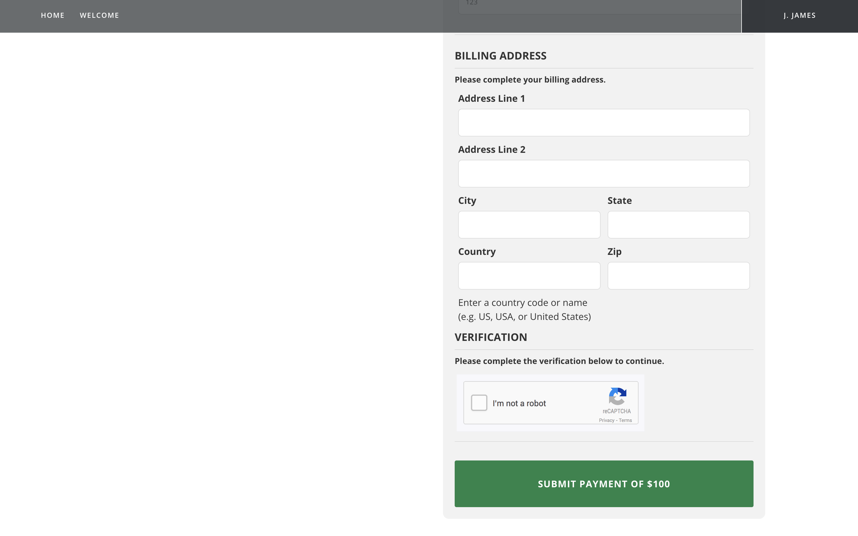 You may also see a 'captcha' verification displayed at the bottom of the form - if displayed, this must be completed before you submit your card details to be processed. Once all the required fields and/or captcha are completed, you can submit your payment and complete registration.