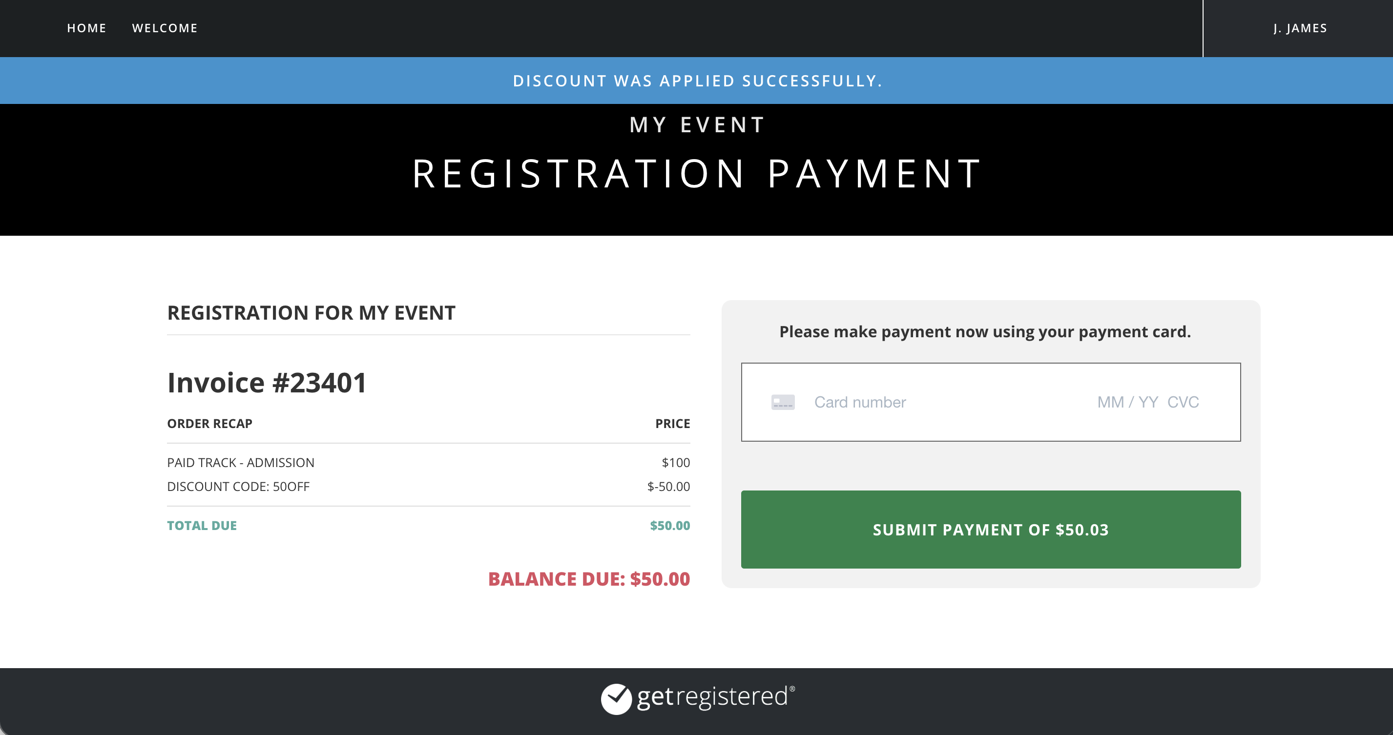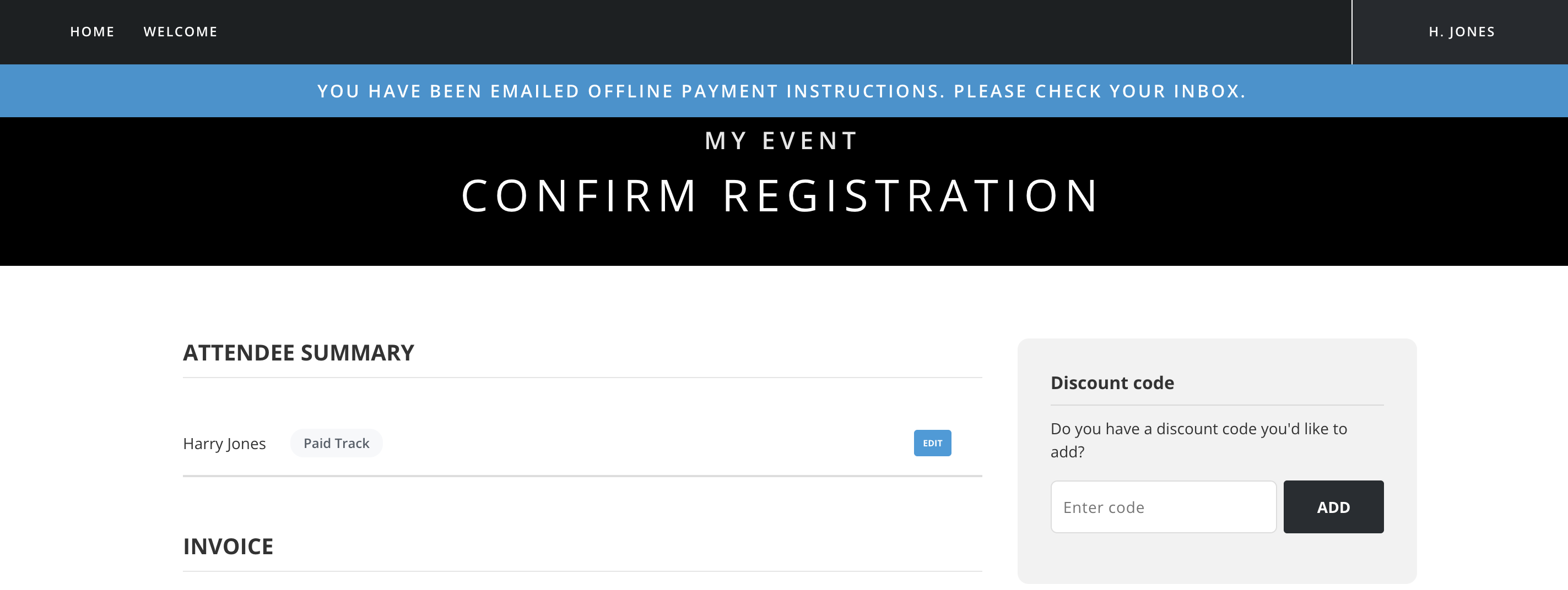 Just type in the code into the field provided and click 'Add' - as long as the discount code is valid for your registration, it will be applied and your invoice will be adjusted accordingly: