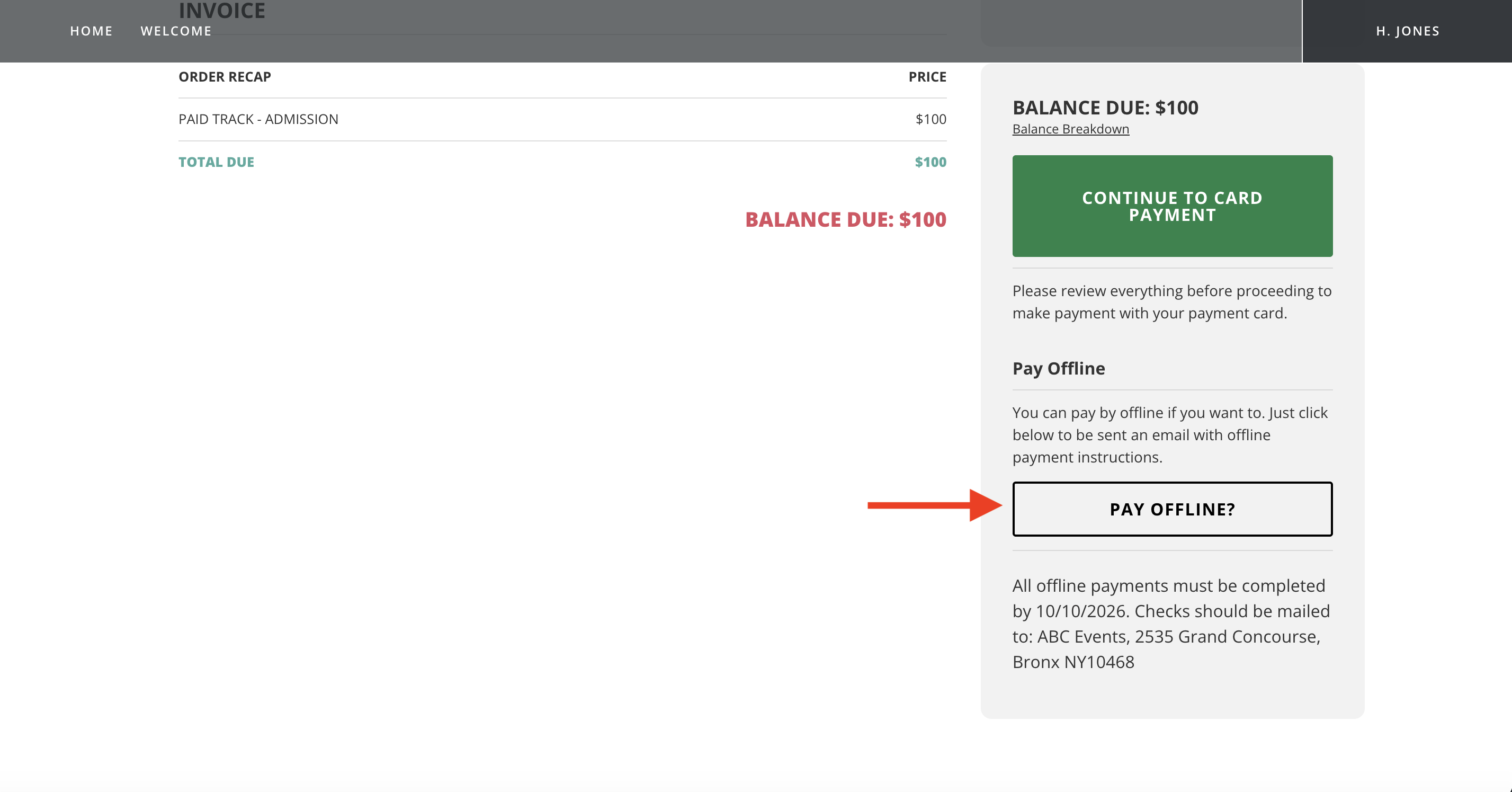 If your event administrator accepts offline payments (such as a check or other form of offline payment), you will see the option 'Pay Offline?' displayed on your registration confirmation page: