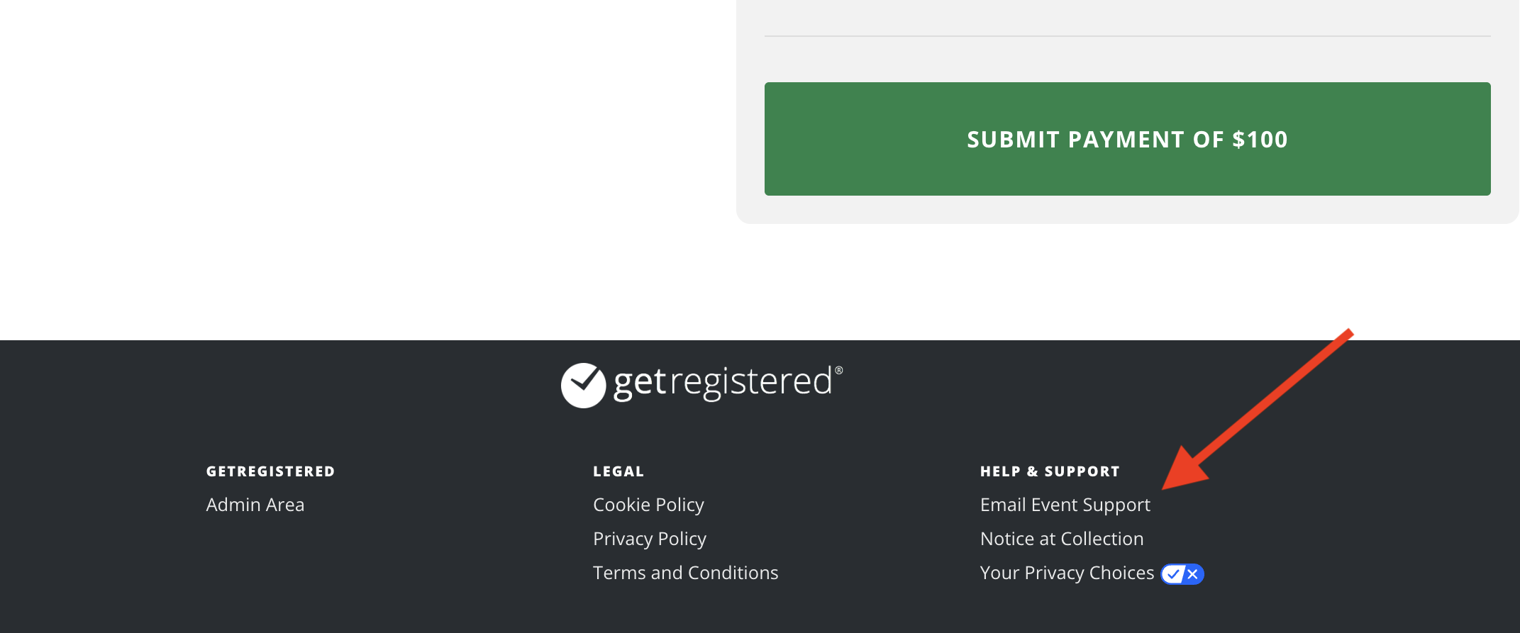 If you attempt to pay for your registration and receive an error on checkout, you will need to contact your event administrator directly. If you do not have any contact details for your event administrator, if the administrator has added a support email address to getregistered®, you can contact them directly by clicking on the 'Email Event Support' button at the bottom of the page: